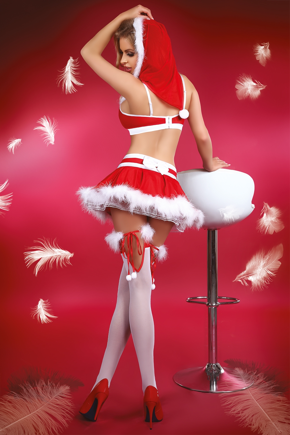 Vianočný kostým Little Miss Christmas LivCo má podprsenku sa zapínanie na háčiky ušitú z jemného pružného materiálu, ktorý je ozdobený bielym lemovaním. Medzi košíčkami je dlhá biela mašľa. Ramienka sú nastaviteľné. Rozšírená sukienka má spodnú časť obšitú snehobielym načechraným perím, rovnako ako kapucňa. Pančuchy ozdobené stuhami, ktorú sú ukončené ozdobnými brmbolcami sú tiež súčasťou kostýmu.