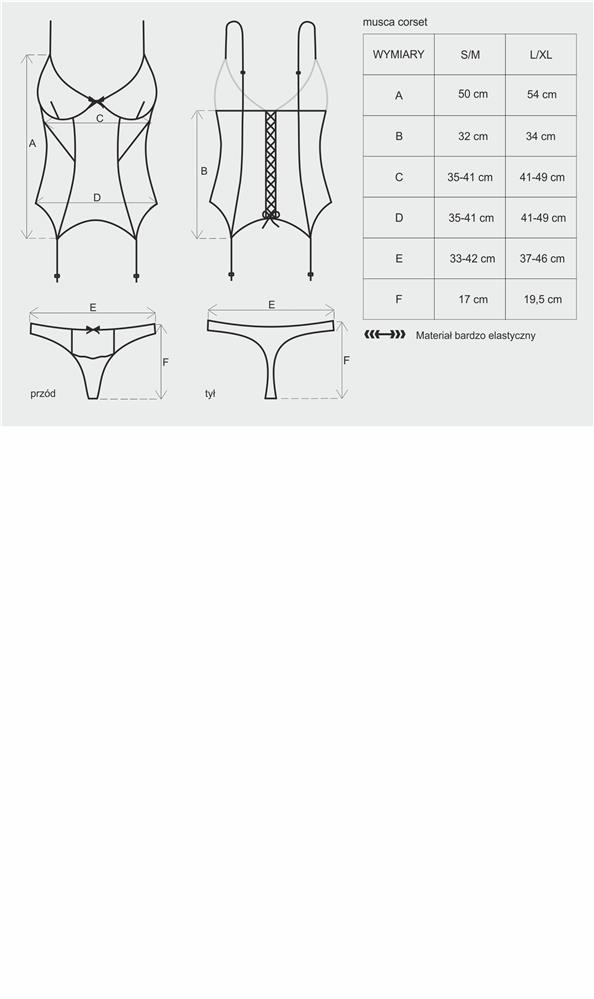 Snový korzet s květinovým a vínově červeným akcentem. průsvitný materiál, odhalující tělo nastavitelná ramínka – perfektně padnou výstřih zdobený jemnou krajkou s květinovým motivem podprsenka s kosticemi je navíc zdobená půvabnou saténovou mašlí trojúhelníkové, krajkové prvky a svislé výšivky vizuálně zeštíhlují postavu okraje zdobené vínově červenou krajkou korzet je v kombinaci s nastavitelnými podvazky (ke kompletuje je možné dokoupit Musca stockings) díky šněrování perfektně padne v kompletu se sexy krajkovými tangami (viz produkt Musca thong) velmi příjemný, pružný materiál (94% polyamid, 6% elastan) kategorie: sexy velikosti: S/M, L/XL viz také: Musca babydoll, Musca chemise, Musca set, Musca shorties, Musca stockings, Musca teddy, Musca thong