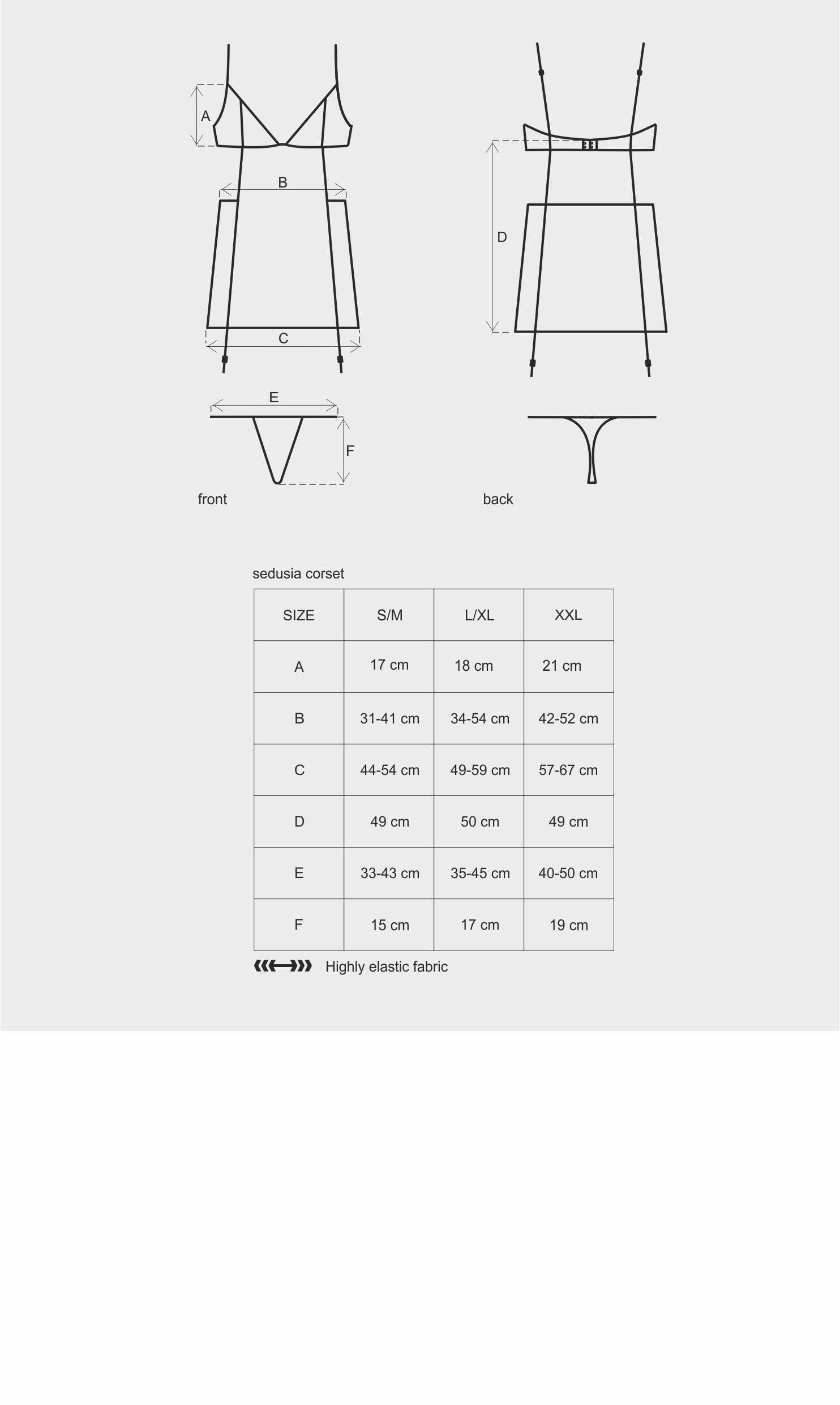 Sedusia corsetKus vašeho skrytého rozmaru ... je přímo v této krabičce. Nechte tyto neuvěřitelně žhavé detaily zahrát si s Vámi a pociťte je na své kůži! Je nejlepší chvíle podělit se o sebe s někým speciálním!Elegantní detaily Sedusia korzetu:- prodloužný korzet s krajkovou výzdobou- černá síťovina zdobená hnědou krajkou- měkké košíčky - perfektní design také pro malé prsa- nastavitelná ramínka- elastická ramínka: díky nim se korzet skvěle přizpůsobí tvaru těla- vertikální prošívání a tkanina zakrývající břicho - pro zeštíhlující efekt- elastická síťovina a pěkné krajky (94% polyamid, 6% elastan)Velikost: S / M, L / XL,Může se Vám líbit: Sedusia shorties, sedusia punčochy, Sedusia teddy