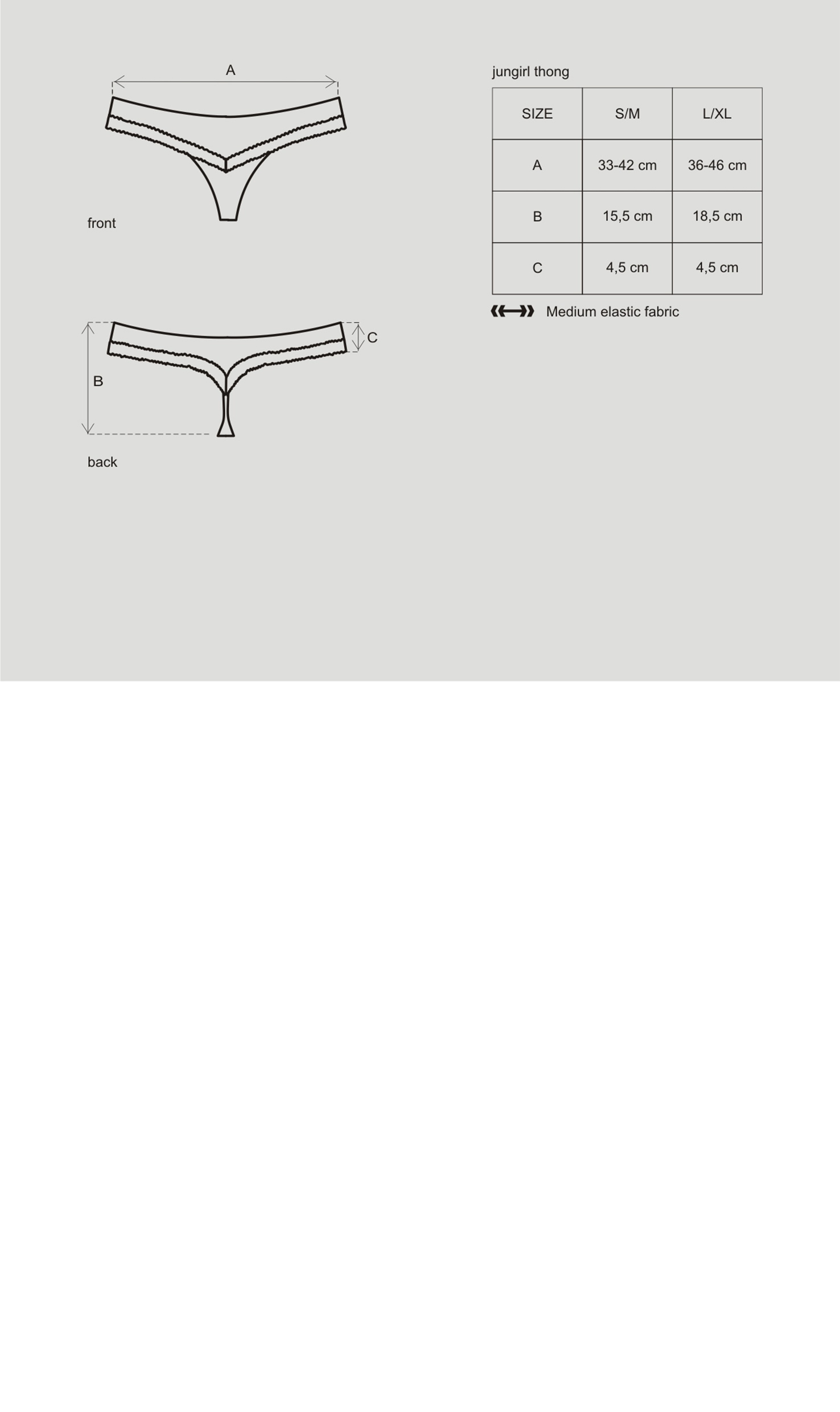 Jungirl tanga Co je uvnitř malé, červené krabičky? Jeden neuvěřitelně sexy kousek prádla, který vás změní ve skutečnou dračici. Tanga jsou z příjemného materiálu se zvířecím motive, jen si je obléci! Od této chvíle budete jako šelma! Detaily tang Jungirl: - Svůdná tanga se zvířecím motive. - Vpředu i na zadečku jsou krajkové motivy. - Příjemný, měkký materiál, který krásně padne na tělo (89% polyester, 11% elastin) - Kategorie: erotické - Velikosti: S/M, L/XL.